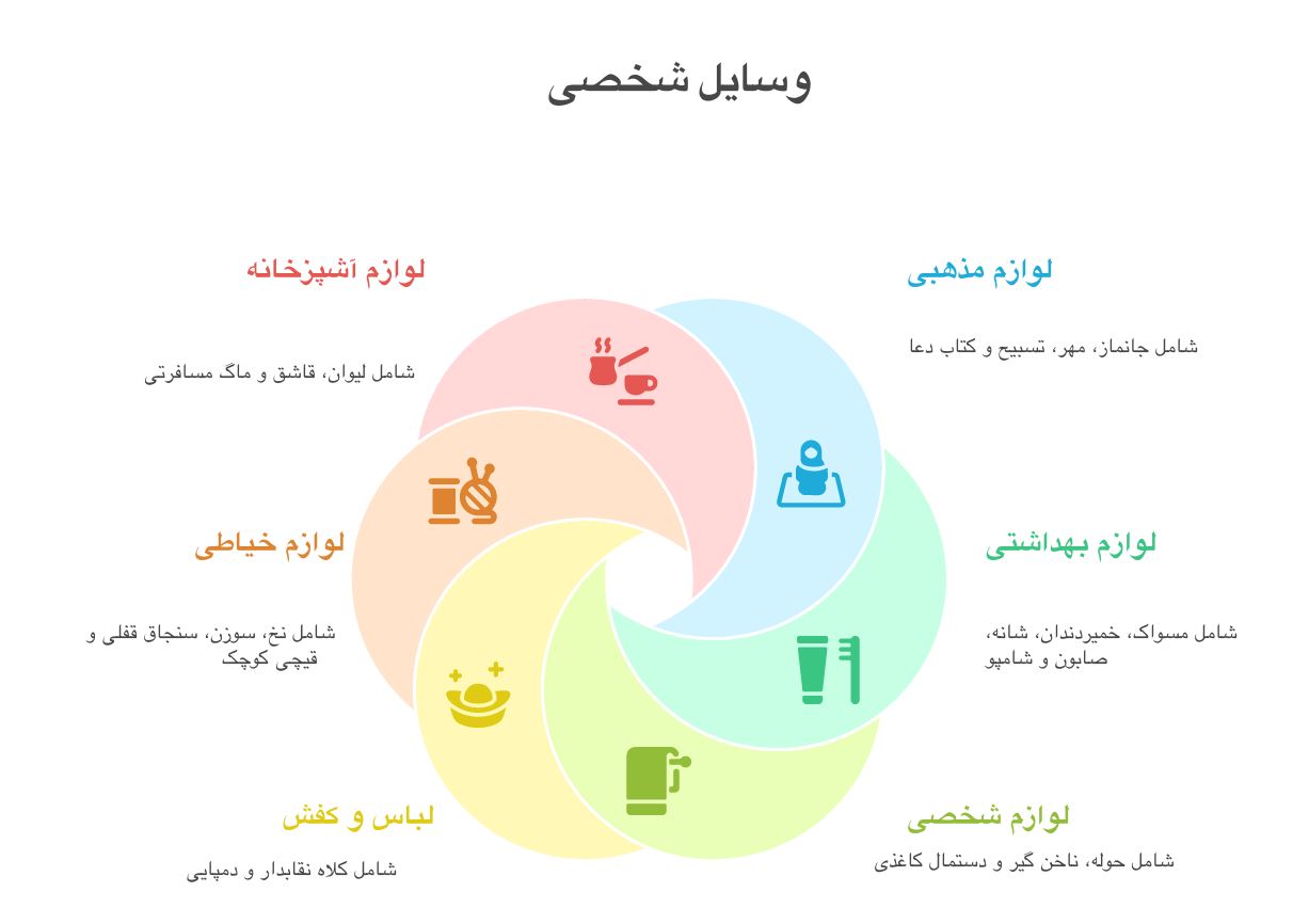 مسواک، خمیردندان، شانه یا برس کوچک، صابون و یا کمی مایع دستشویی، شامپو،یک حوله کوچک یا چفیه برای حمام، ناخن گیر، دستمال کاغذی